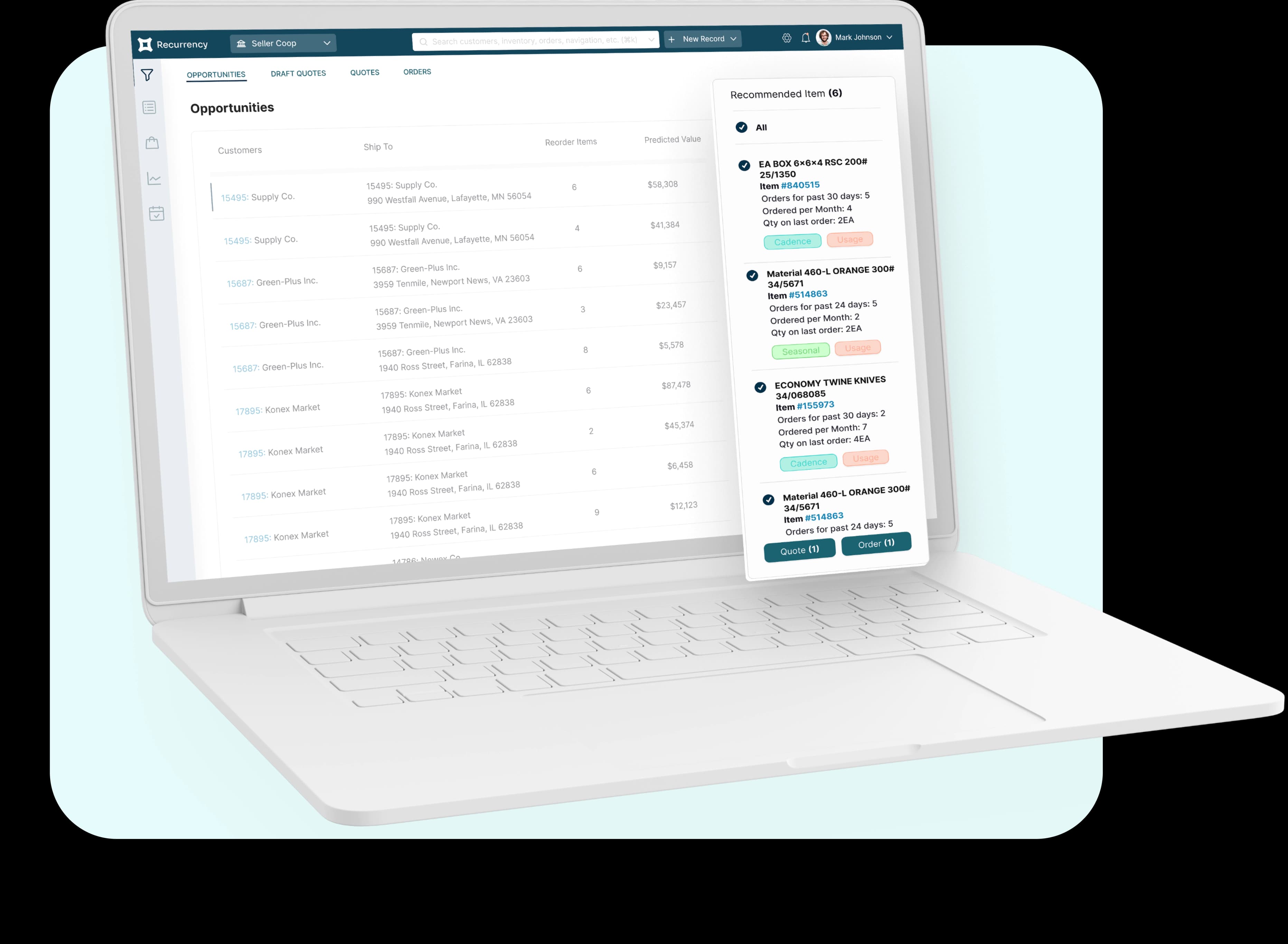 Recurrency’s end-to-end functionality allows you to generate quotes, orders, and invoices nearly four times as fast with fewer clicks and without ever having to leave the Recurrency platform. Get everything you need, all in one place.